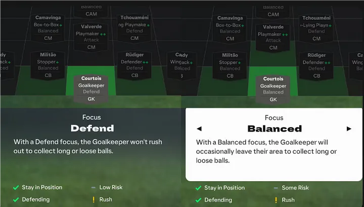 Focus: Defend. With a Defend focus, the Goalkeeper won’t rush out to collect long or loose balls.