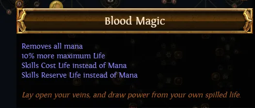 Blood Magic is a powerful choice for builds that want to focus entirely on life as their primary resource. It works particularly well with builds that have high life pools, strong life regeneration, or that can mitigate the loss of life through other means such as leeching or life recovery on hit.