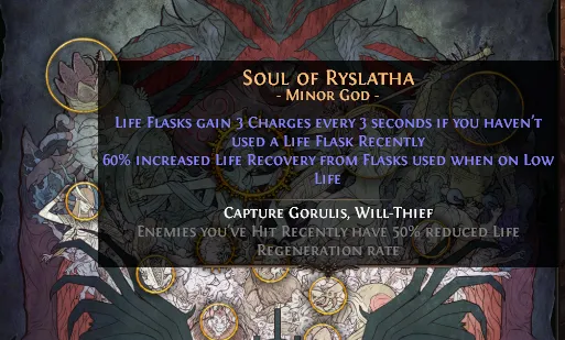 The Soul of Ryslatha offers valuable defensive buffs, particularly in enhancing life recovery from flasks and maintaining flask charges. Here’s the base ability and its potential upgrade: