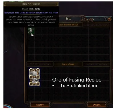 To use this recipe, simply sell any item with six linked sockets to a vendor. It doesn’t matter if the item is a weapon or armor, or whether it is normal, magic, rare, or unique — the key requirement is that all six sockets must be linked together. When you sell the six-linked item, the vendor will give you 20 Orbs of Fusing in exchange.