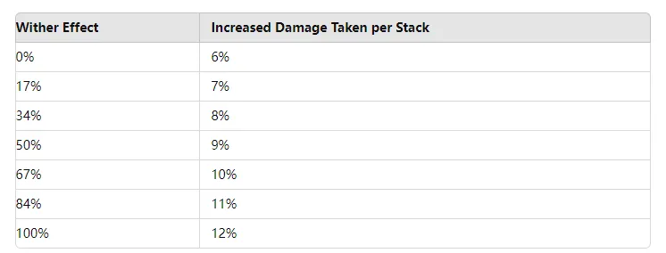 The effect of Withered can be further enhanced by increasing its effectiveness through passives, gear, or other modifiers. However, due to the way Withered stacks independently, the increased effect of Withered only reaches significant breakpoints at specific intervals.